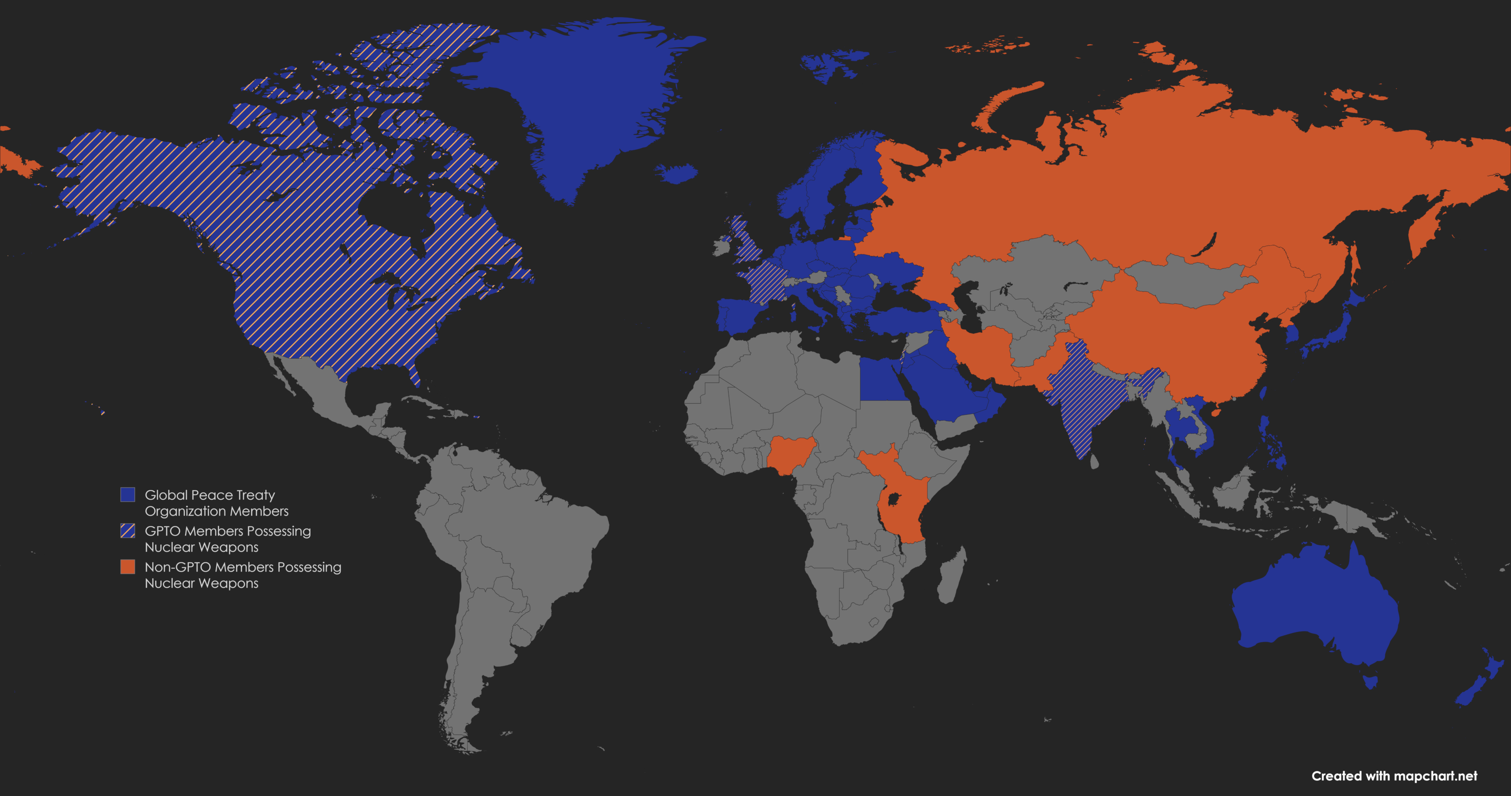 A map showing GPTO members in blue, with nuclear-armed members having gold hashes. It also shows nuclear-armed non-GPTO member states.